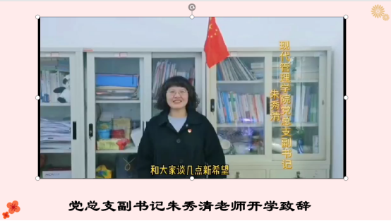 始业教育第一部分,各班级观看党总支副书记朱秀清老师录制的开学致辞。朱老师从家国情怀、理想信念、班风班纪、安全教育四个方面部署春季工作安排,并从身、心、行、情四个方面提出努力目标并希望同学们在虎年新学期生活上生龙活虎,精神上气吞万里如虎。