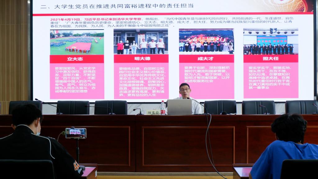 现代管理学院党总支书记项光春以《新时代共同富裕与大学生党员的责任担当》为主题,讲述了新时代共同富裕的内涵、价值、路径等,带领同学深刻体会新时代共同富裕的重要意义。他指出,在推进共同富裕进程中,青年大学生应自觉肩负起使命担当,同新时代同向同行,共同前进,让青春在为祖国、为民族、为人民,为人类的不懈奋斗之中绽放出绚丽之花。