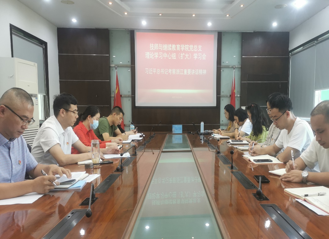 10月18日下午,技师与继续教育学院党总支召开理论中心组(扩大)学习会,传达学习贯彻习近平总书记考察浙江重要讲话精神。党总支班子成员及下属两个党支部全体党员参加了本次学习会,学院党总支书记程瑞存主持会议并讲话。