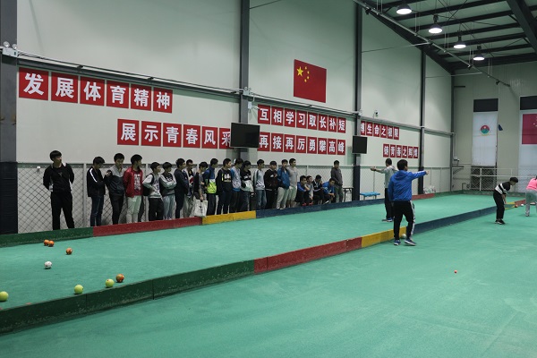 吴学亮老师介绍了地掷球在我院的发展,分享了近年来地掷球所取得的优秀成绩,鼓励同学们要爱国、爱校、爱集体、爱自己。范杉老师对于爱国有自己特有的情怀,他结合自己参加世界级的比赛,并且指导学生夺得世界级比赛冠军的经历和感悟,向大家诠释了大学生该如何爱国。李春峰老师从自己不知道地掷球到夺得地掷球世界冠军,由学生到老师身份的转变等角度,教导同学们要感恩、要奉献、要有梦想。最后在两位老师的带领下,同学们来到E立方体育馆,体验地掷球运动。