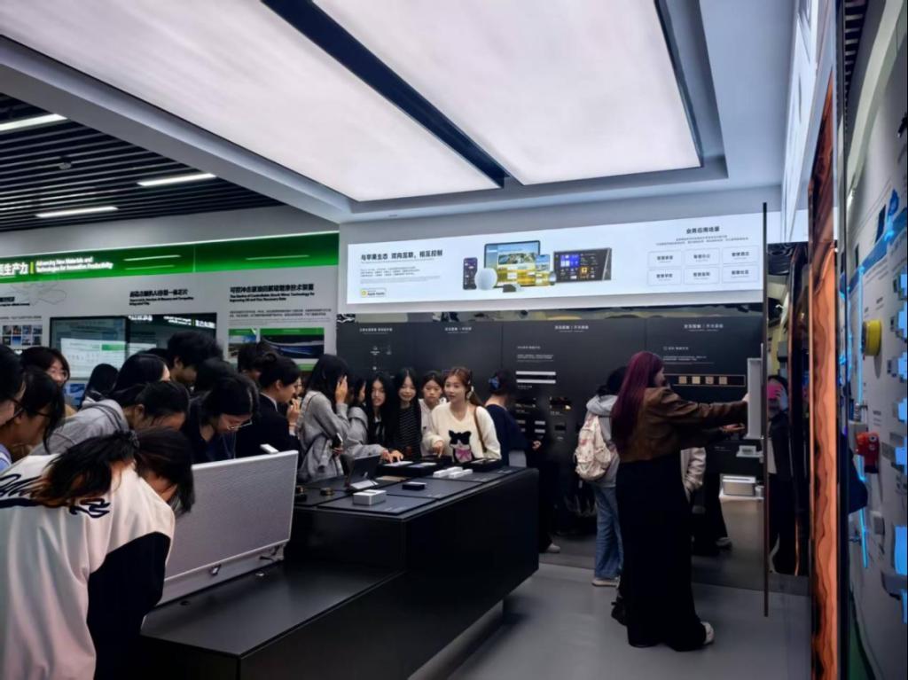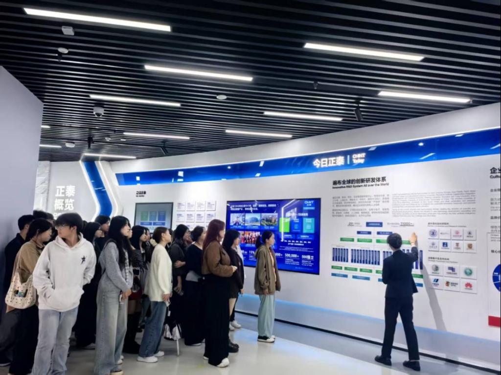 在正泰创新体验中心,讲解员为师生系统介绍了正泰的发展历程、企业文化、社会责任、企业荣誉、全球区域本土化战略等内容,其中重点介绍了正泰的智能制造工厂、低压电器生产线、智能配电物联网系统,光伏新能源全产业链布局与全场景绿色能源电站的开发建设。在现场,学生通过体验全屋智能系统和观看企业宣传视频,对正泰在绿色能源与智能制造领域的领先实践有了更加全面的认识。