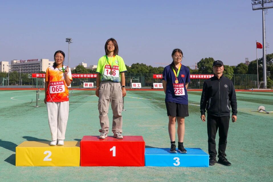操场上,颁奖仪式简洁而热烈。光电制造学院的师生围聚一处,目光热切地聚焦于中心。站在领奖台上的代表脸上洋溢着欣慰与自豪,台下的队员们昂首挺胸,眼中闪着拼搏后的光亮。