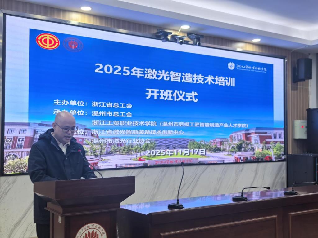 2025年11月17日上午,由浙江省总工会主办,温州市总工会、浙江工贸职业技术学院(温州市劳模工匠智能制造产业人才学院)承办,浙江省激光智能装备技术创新中心、温州市激光行业协会协办的“2025年激光智造技术培训项目”在学校瓯江口校区正式开班。来自全省20多家企业及院校的36名学员,将围绕激光智能制造技术、激光智能装备结构及功能、激光智能装备装调(虚拟仿真)、激光制造工艺技术、激光精密制造技术等内容开展为期5天的集中培训。浙江工贸职业技术学院光电制造学院(温州市劳模工匠智能制造产业人才学院)院长郑道友,智能光电制造技术专业主任钟正根参加本次开班仪式。开班仪式由光电制造学院副院长金露凡博士主持。