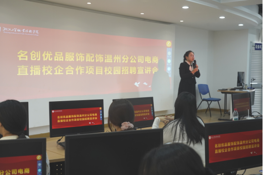 2025年12月1日下午,名创优品服饰配饰温州分公司电商直播校企合作项目校园招聘宣讲会在浙江工贸职业技术学院府东路校区成功举办。本次活动吸引了电子商务、商务数据分析与应用等专业近百名学生参与,现场气氛热烈,互动积极。