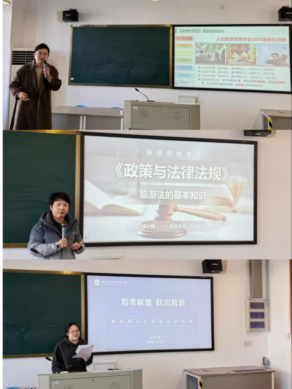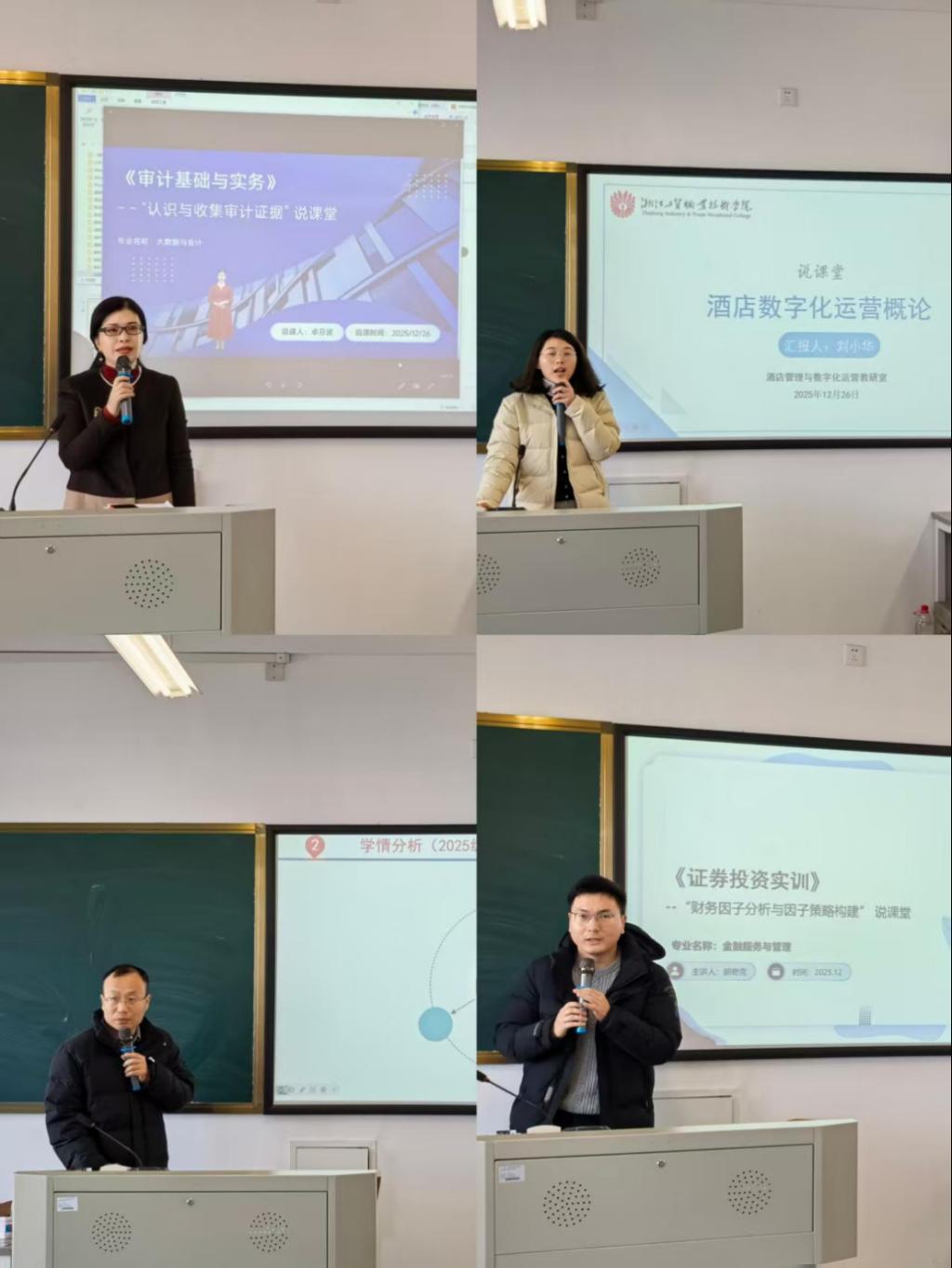 12月26日,现代管理学院举办“AI赋新能・慧教提质效——人工智能驱动课堂教学创新实践”2025年秋季学期教师“说课堂”主题教研活动。学院院长王国银、副院长孙富山、副院长朱秀清、党总支副书记贾飞祥及旅游管理专业罗冬梅老师担任评委,各专业(教研室)教师参与活动。