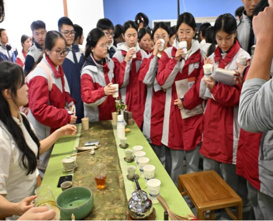 茶艺展示区以春夏秋冬为主题铺展茶席,素雅茶服与精致茶具相映成趣。学子们依循专业流程,流畅完成温杯、置茶、注水、出汤等一系列茶艺操作,动作规范优雅。茶汤入杯时茶香袅袅,瞬间弥漫整个展厅,尽显旅游服务专业的礼仪素养与实操能力。与之相对的围炉煮茶体验区暖意融融,参观者围坐炉边煮茶闲谈,沉浸式感受文旅融合的闲适氛围。