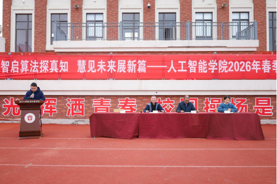3月8日下午,人工智能学院2026年春季始业教育大会在操场举行。学院党总支书记冯士活、党总支副书记洪长存、副院长钱月钟、学工办主任、全体辅导员、班主任、全体24、25级学生参加会议,大会由学院党总支副书记洪长存主持。
