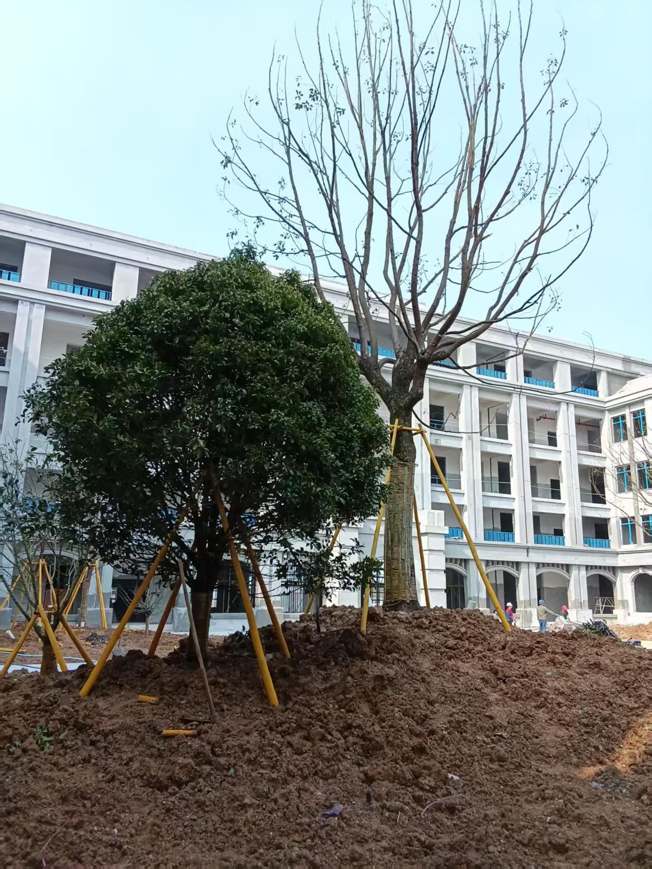 眼下绿意正萌动、春色已渐浓,正是苗木进场的最佳时机。为了更好保护树木、呈现最佳观赏效果,采用全冠移植的树木迎来了“绿色迁徙”,正式落地实训楼标段。工作人员严格按照标准化流程操作:吊运、入坑、临时支撑、覆土、浇灌……每一道工序都精准把控。从苗木定位到角度调整,从避开地下管网到优化整体布局,展现出树木最美的一面,让树木和建筑景观融为一体,注入鲜活灵动的自然底色。