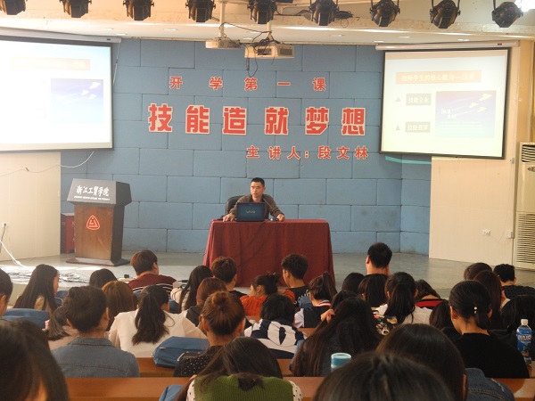 技师学院(温州校区)按学生层次,分别举办了三次以技能成就梦想为主题的讲座,讲座由教学主任段文林老师主讲,讲座内容开始以《西游记》为例,论述成功的四要素体力(沙僧)、理性(唐僧)、欲望(八戒)、能力(悟空)之间的关系,并指出学生的核心能力就是专业技能,在激发学生兴趣后,随后恰到好处地讲述了技能立业的我校优秀毕业生具体事例,并描述了当前技能强国的重要契机:我国选手连续参加三届世界技能大赛,成绩一次比一次显著。也大力指出了当前市场紧缺人才是高技能、专业性、适用型职业技能人才。并要求全体同学为实现 “中国梦”而努力,身为中华民族的一员、作为一名中国人、新时代的职业技能学生,我们的梦就是民族梦、中国梦。考大学的梦破灭了,但是,我们也有着和莘莘学子一样报效祖国、奉献社会、为伟大祖国奉献自己的青春、智慧和力量的机会和梦想。要成长为一个有梦想、刻苦学习、苦练专业技能,用自己的一技之能为社会做贡献、为伟大祖国的繁荣昌盛添砖加瓦的优秀学生。 然后肯定了我们的学生在理论学习、专业技能的训练、技能大赛中,也付出了自己艰辛的努力;最后指出: “条条大陆通罗马”的职业技能学生,同样可以品学兼优,同样可以成为祖国的栋梁之材。我们有能力向所有的人诠释职业技能学生通过自己艰辛的努力,同样可以得到社会的认可,同样可以找回自信,同样可以为祖国做出贡献。