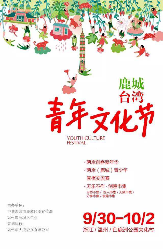 由中共温州市鹿城区委宣传部,温州市鹿城区台办主办的“鹿城台湾青年文化节-创意市集”即两岸传统民间工艺与青年时尚文创市集9月30号在白鹿洲公园文化村(南塘街对岸)正式拉开帷幕,此次活动为“鹿城·台湾”青年文化节活动的重要组成部分。