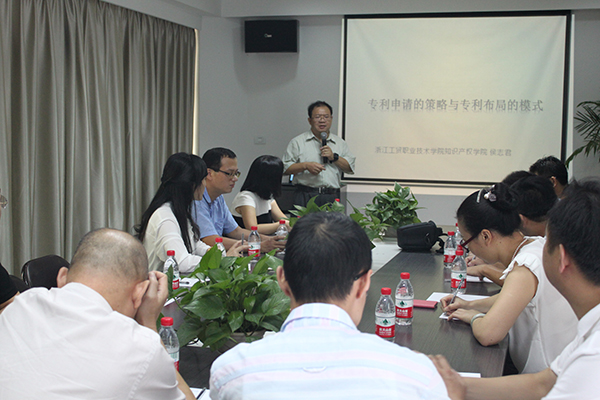 之后,在知识产权学院会议室里,来自台湾的侯志君博士为大家作了简短的讲座。侯志君博士的讲座题为《专利申请的策略与专利布局的模式》,主要围绕如何深入挖掘发明专利点,专利文件撰写以及专利申请中常见问题等展开。讲座以中小企业技术发明申请的专利为实例,详细说明了专利申报过程中应注意的事项。在场的16位企业家听完侯博士的讲座后,纷纷发表了自己的观点,与侯博士进行探讨。