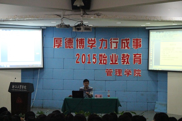 首先,潘毅老师对2015级新生能选择工贸就读表示热烈欢迎。随后潘毅老师分别从“大学与中学的不同”和“大学之理念与精神”两方面为15级新生分享了他的理解与经验。其目的是为了让大一新生尽快的进行角色转换,更是告诫同学要以充沛的精力面对大学生活。