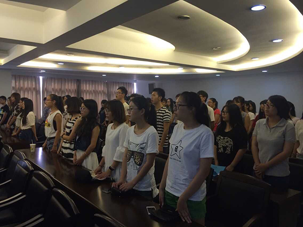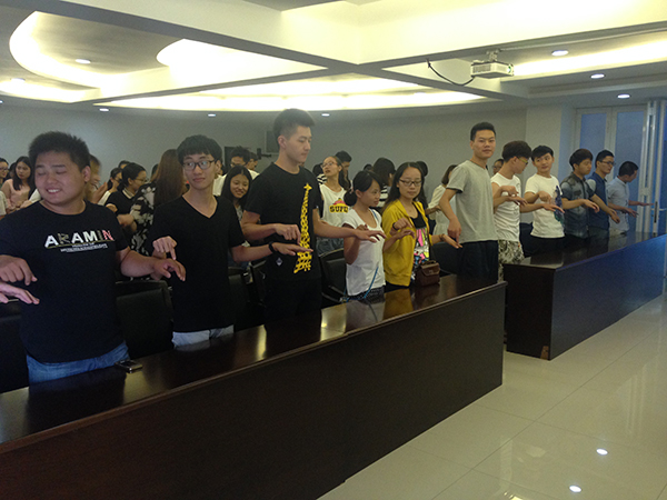 始业教育以老师们和同学们的互动游戏“抓住快乐”拉开序幕,老师们和同学们在欢快的游戏中,互相合作,消除了陌生感,增强了集体凝聚力。紧接着,学院还给学生播放了爱国主义教育——讲述的是抗日先烈们为今天幸福生活抛头颅、洒热血的视频。一个个抗战镜头深深地感染了在场的每一位师生。当视频播放到唱国歌的时候,全体师生都不约而同地起立,跟着一起高唱国歌。