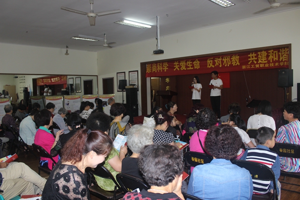 在主持人幽默诙谐的言语中整个活动推至高潮,不少社区居民在主持人未读完题目时就举手蓄势待发,当然实践队员也带来了丰厚的奖品,据了解,本次活动的经费来自于鹿城区反邪教协会的支持以及学院团委的支持,在此我代表全体实践队员对鹿城区反邪教协会以及浙江工贸职业技术学院的支持表示由衷的感谢。之后,是反邪教宣传册模特走秀以及歌曲《萍聚》的表演,在场观众无一不为实践队队员进行喝彩,这不仅仅给芳园社区居民带来了欢乐,也确切的展示了浙江工贸职业技术学院学子的风采,在母校招生之际实践队员也协助招生办进行学校宣传册的分发,再次证明了实践队员无私奉献的精神。最后,全体实践队员的演唱了大合唱《精忠报国》。