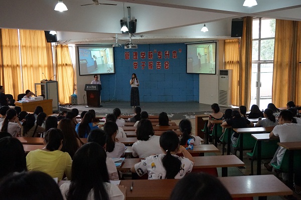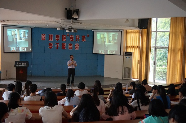 6月12日下午三点半,管理学院“专升本”学子报告会在阶梯教室举行。报告会邀请了2015届管理学院成功升本科的毕业生,还特别邀请了历年专升本成功的管理学院校友代表,通过在线方式与现场同学进行沟通交流,她们分别是会计0604刘春、酒管0701滕伟伟、人力0901何洒莉、导游0901赵建青、会计1004应洁、信管1101范婷婷。在这些同学之中,有从本科院校毕业参加工作的,有马上从本科院校毕业的,还有正在本科院校就读的校友。管理学院2013、2014级各班均派代表参加,报告会由管理学院党总支张勰老师主持。本次活动的主要目的一方面是表彰升本成功的学生;另一方面,通过现场与在线交流,使在校生加深对专升本的认识和理解。