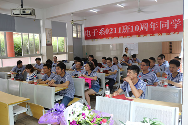 6月26日下午,学院门口的电子屏幕上打出“致电子系0211班十周年同学会”的欢迎标语。原来是电子系电信0211班的同学们,在毕业十周年之际,再次相约、相聚在母校。该班共37人,来自外省的同学多达十几个,毕业后更是各奔东西、天各一方,许多同学更是十年来都未曾谋面过,但在十年后这个火热的夏天,内心深处共同的渴望吸引着大家从广东、福建、山东、江西、上海、杭州、宁波、金华等全国各地重新回到十年前梦想的起航点。