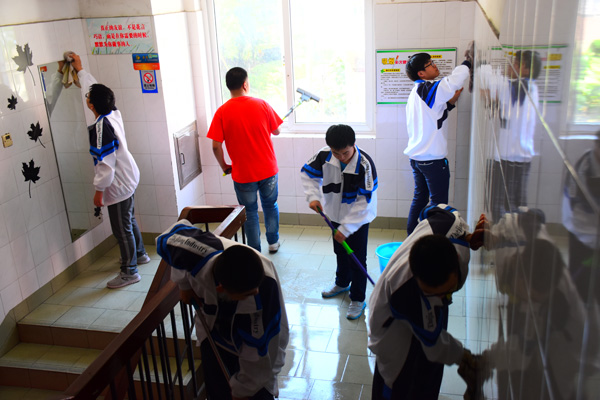 5月13日中午,为了响应学院“协同创新”年主题,配合学院红五月学生活动,学生公寓开展党建工作进公寓系列活动。学生公寓C幢由高职、技师、成教学院的学生党员、预备党员、建党对象,院宿管会楼层长和纪检部、班干部等30多名同学组成的青年志愿者在公寓辅导员徐剑敏、薛明银,管理员余非、程玮华老师带领下,开展“明德修身,我爱我家,美化公寓环境”活动。大家一起在C幢学生公寓擦洗玻璃、瓷砖,清理蜘蛛网,清扫通道和楼梯、清洗寝室卫生间等,为同学们带来舒适的居住环境,创造优美的校园环境。