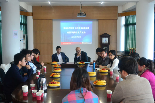 座谈会上,汪老师代表全院师生对校友回校参加55周年校庆表示热烈欢迎,向校友们全面介绍了学校当前发展状况及近年来的改革与创新成果,并恳请校友们为我院专业改革建设多提宝贵意见。在座的校友们踊跃发言,建言献策。校友们首先介绍了自己的工作情况和工作体会,并就相关专业的课程内容等方面提出了建设性意见和建议。原国贸1103班校友胡畏认为,目前该班同学很多都在做电商,建议国贸专业都开一些电子商务类相关课程;现在自己开办了宁波泰伦特气模有限公司和宁波泰伦特进出口有限公司2家公司的原商务英语0602班校友徐斌建议,学院多加强学生的人文素质和综合素质的培养,为将来创业打下良好基础。
