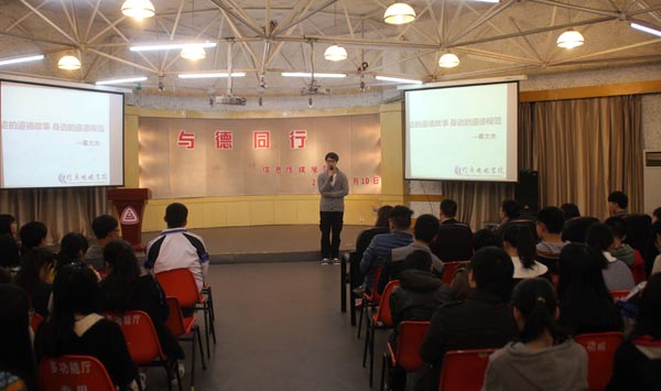 4月10日,信息传媒学院在多功能厅举行了以“与德同行,学习贯彻‘四个全面’”为主题的道德讲堂暨入党积极分子培训。