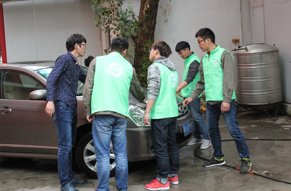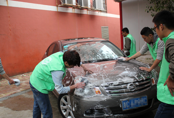 活动志愿者为大一学生,为避免新手因经验不足而误伤汽车,每辆车的清洗都先由高年级学生进行督导,并在一旁监督洗车过程。志愿者们进行分工合作,有序安排,保证了洗车的质量和速度。
