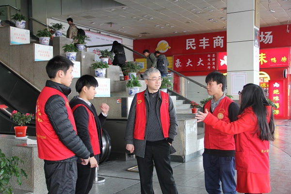 “你来自哪里?”“你是哪个专业的?”“英语过了几级?”“有没有想家了?”,贺院长十分关心志愿者情况,并详细询问了今年购买和往年有哪些不一样、买了多少张票、为什么做志愿者等等问题。红马甲志愿者张巧静表示今年已经是她第二年参加网络购票活动,这个活动非常有意义,同学们积极性也非常高,明年还要继续参加。贺院长高度赞扬了红马甲志愿者的无私奉献精神,他鼓励志愿者们要充分发挥自己的知识优势和专业特长帮助更多的温州新居民,让他们早日实现返乡团圆梦,同时也希望同学们平时积极参加各种社会公益活动,在服务他人的过程中,锻炼自己本领,实现自身价值。