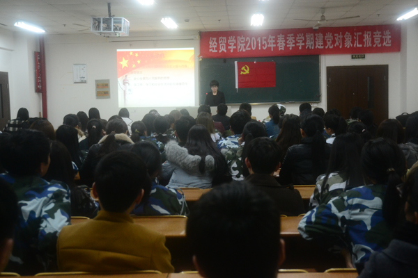 3月6日晚,经贸学院在6202教室举行2015年春季建党对象汇报竞选。此次汇报竞选是经贸学院2015年春季学期建党对象推荐的环节之一,16位候选人经过层层选拔,进入最后汇报竞选环节。