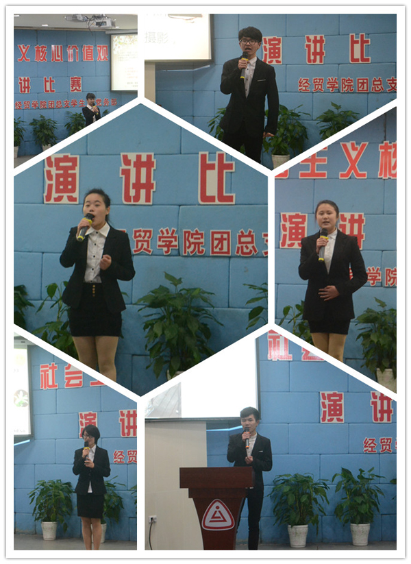 12月30日,经贸学院“我为社会主义核心价值观代言”演讲比赛在1号楼阶梯教室举行,畅响新年“青年好声音”。经贸学院团总支书记高莎、辅导员周妍妍、郑雪琦,经贸学院团总支学生会主席团部长团及2014级全体学生参加了此次比赛。