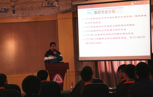教研室主任李老师则针对专业培养的问题着重跟同学们介绍了分院数控专业的培养方案和课程设置的相关情况,并列举了专业相关各类证书的考试情况,李老师还跟同学们讲述了目前数控专业的就业形势,鼓励同学们积极参加学科竞赛。接下来,学生干部上台从自身角度跟大家分享了在校的学习生活、社团活动等经历。
