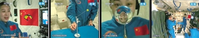 10时11分,地面课堂建立与天宫一号的双向通信链路,从距离地球300多公里的太空传来了航天员亲切的招呼声“同学们好!”,多功能厅里爆发出了热烈的掌声。在天宫课堂里,“神十”女航天员王亚平化身成老师,指令长聂海胜当起了“助教”,张晓光则担任起摄像师,手持摄像机持续拍摄,以记录精彩一课。