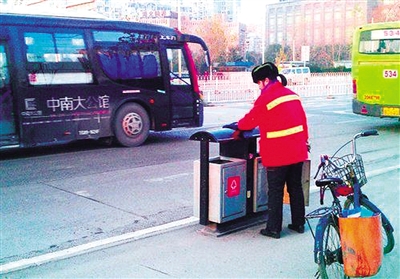 1月1日,余友珍照常上班,骑自行车沿途擦洗垃圾箱 。 《武汉晚报》供图