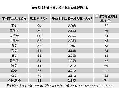 2008届本科毕业生的收入明显下降,“211”院校的毕业生半年后的月收入是2549元、非“211”本科院校为2030元、高职高专为1647元,而2007届这三类大学毕业生收入分别为2949元、2282元、1735元,2008届毕业生平均月收入下降幅度分别为14%、11%、5%,本科毕业生收入下降特别明显。2008届本科毕业生的半年后月收入经济学大类最高、医学类最低,高职高专毕业生半年后月收入最高是公安大类、半年后月收入最低是医药卫生大类。