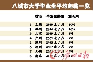 在广州就业的大学毕业生,今年的薪酬起薪平均为2561元/月,在全国位居第四,相比去年增长了9%。