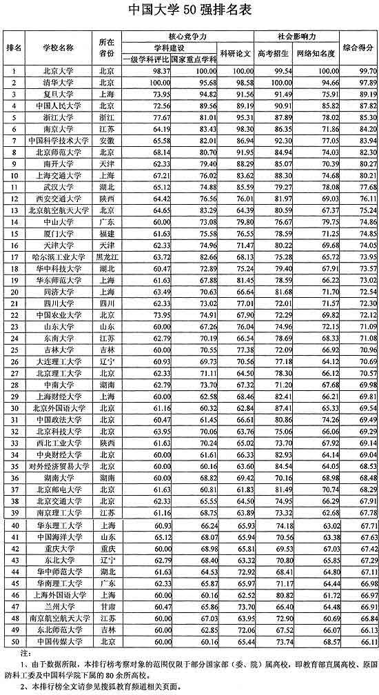 据了解,此次“中国大学50强”排行榜从核心竞争力和社会影响力两大方面考察一所大学。在评价核心竞争力(占60%权重)时,选取学科建设和科研论文作为反映办学和科研实力的一级指标。以科研论文为例,分别选取了各自领域中最具代表性的SCI(科学引文索引)收录论文和CSSCI(中文社会科学引文索引)收录论文两个二级指标,各占一半比重。然后以2004~2006年3年间收录论文的总数和结构得分(论文总数与该校专任教师数量的比值)计算出标准化分数来进行比较。