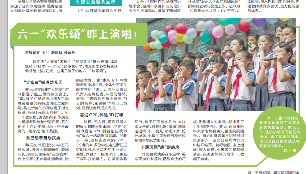现实版“大富翁”游园会、“我型我秀”舞台表演、体验3D打印技术……昨天市区多家小学、幼儿园里各类特色活动相继上演,汇成一曲属于孩子们的六一“欢乐颂”。