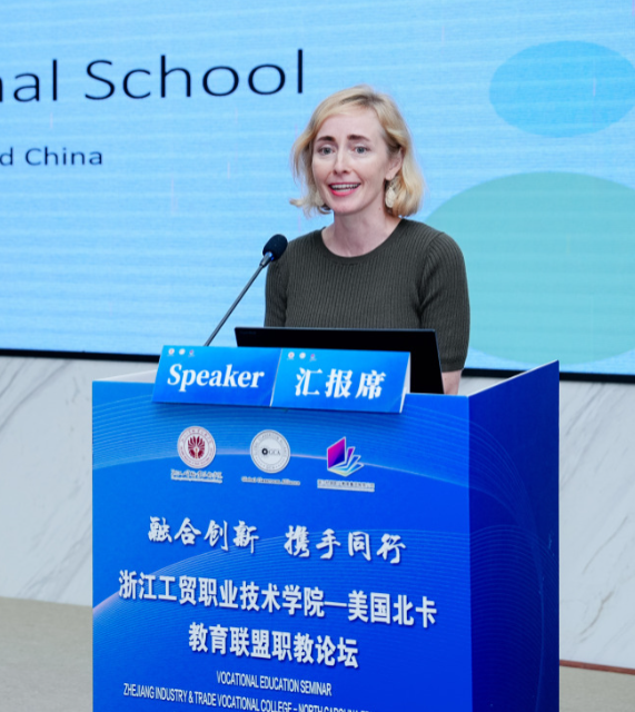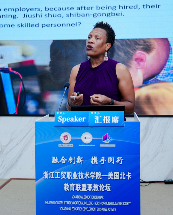 美国北卡职教联盟教师代表帕玛拉·伊利西亚·米切尔针对美国职业教育人才培养展开分享。对于商学院的学生,学校除了开设工商管理、创新创业、国际商务、市场营销及销售等课程之外还会设置实操训练课程和岗位实习,以此来帮助学生提升商业技能。对于工程学院的学生,教师在教学时会将与行业相关的实操项目带入课堂,还会利用最新的工程工具来完成实际项目引导学生学习最新技能。