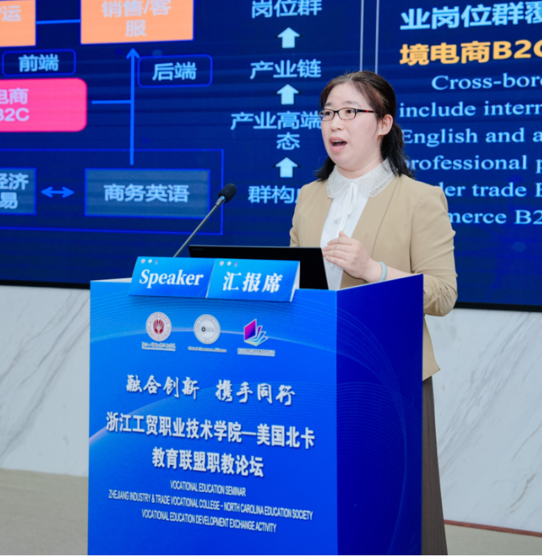 在主旨报告阶段,浙工贸商务英语专业主任王星远作《跨越国界的商业桥梁——探索跨境电商的无限可能》报告,从中美跨境电商现状、跨境电商人才培养、未来的合作展望等方面展开分享。她指出,浙工贸从运营与直播两个方面培养跨境电商专业学生,学生已成功为温州80余家中小微企业提供跨境电商店铺运营与直播服务。她希望,双方将在课程共建、案例共研、技术共享等方面开展更加深入的合作。