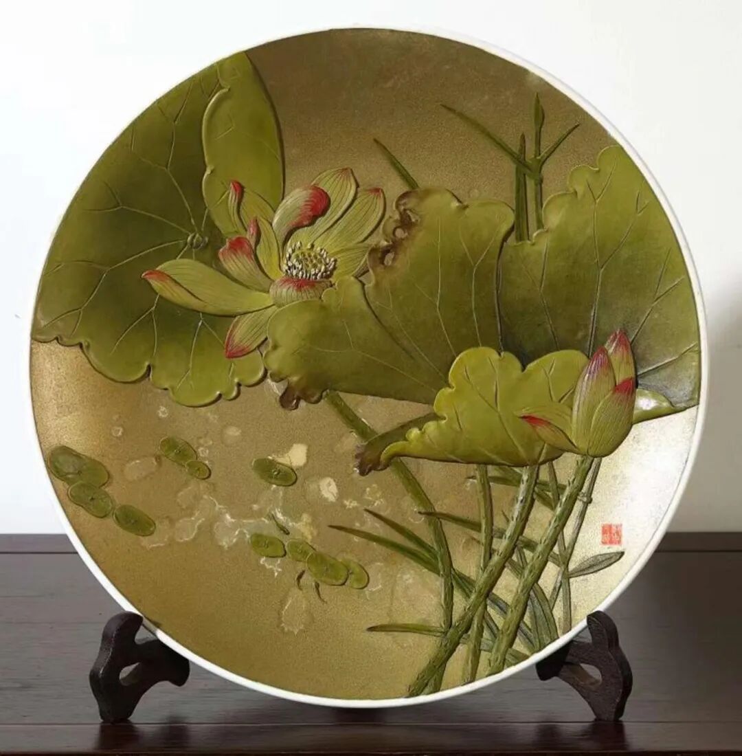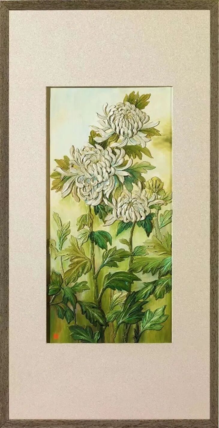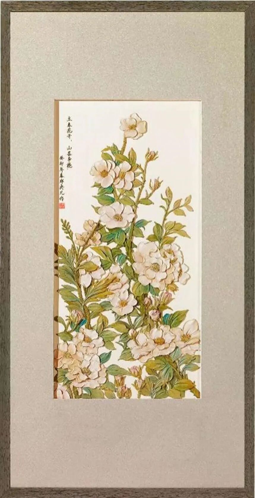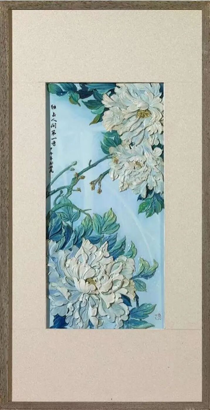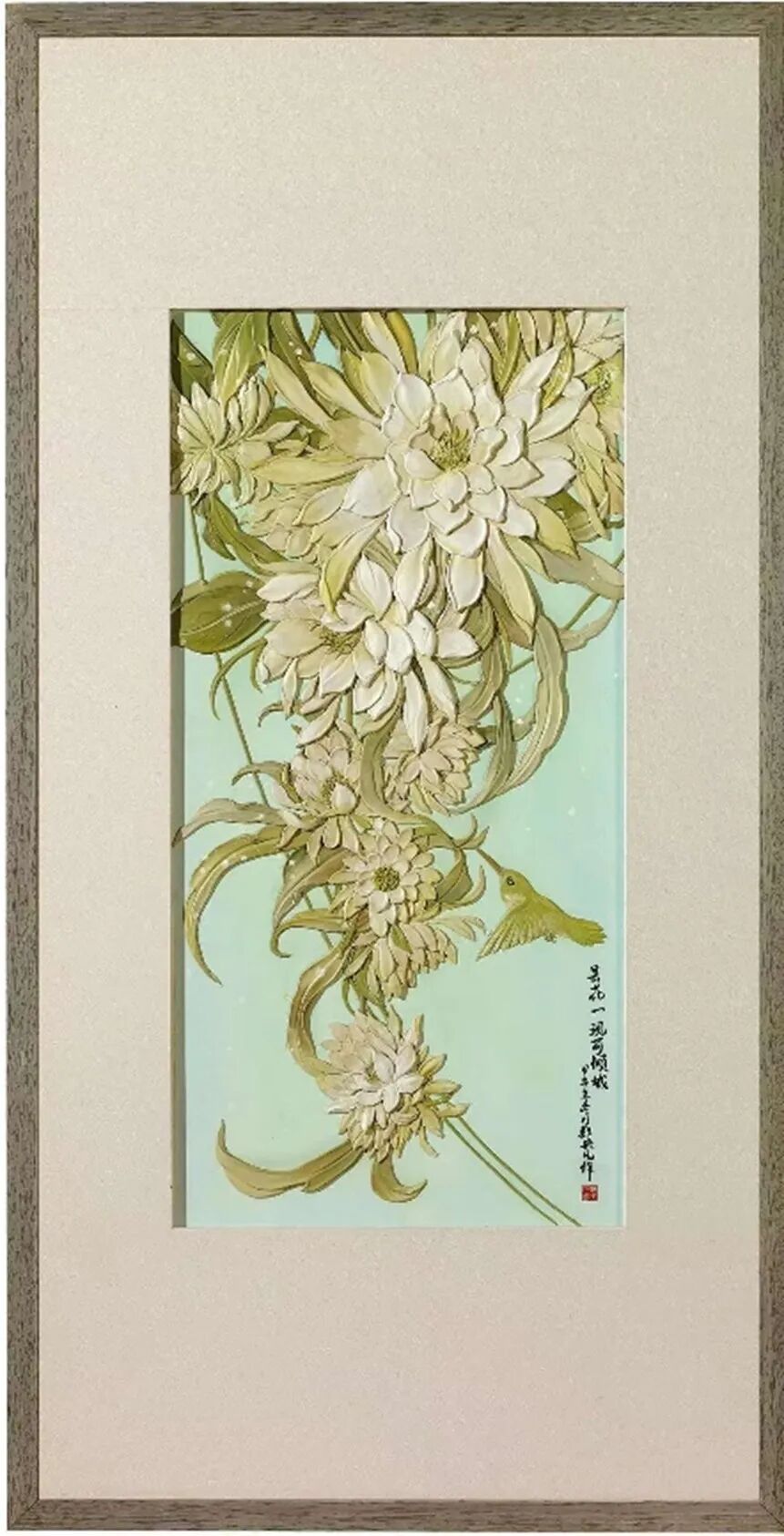 瓯塑,作为温州独有的传统工艺,已有上千年历史,它从堆积工艺中演变而来,集绘画与雕塑之大成,广泛应用于空间装饰领域。郑央凡深知瓯塑的珍贵与独特,通过技法创新、工具研发和材料改良,创作出了一系列富有表现力和艺术价值的瓯塑作品。现累计创作作品上百幅,其中数十幅作品装饰于各大重要场所,多件作品被国家一级博物馆收藏,16件作品获国家级奖项。她的代表作中,《雁荡秋色》无疑是最为引人注目的。这幅装饰于国家人民大会堂浙江厅主背景的作品,以温州雁荡山的人文景观为题材,将传统艺术表现形式与现代艺术风格巧妙融合,展现了瓯塑在色彩表现上的丰富性与气势磅礴的艺术效果。此外,还有装饰于温州市委常委会议室的《瓯越风光》、装饰于温州人民大会堂一楼主题墙的《人杰地灵》,所描绘的均是温州具有世界影响力的人文元素。