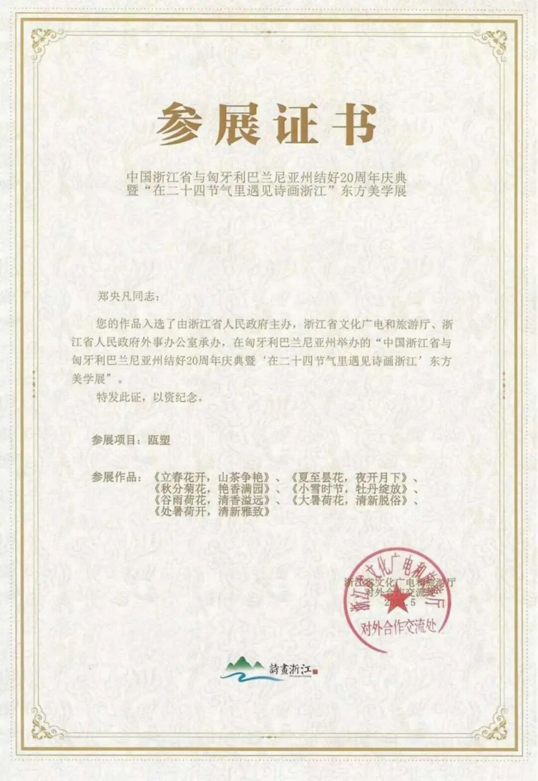 近日,浙江工贸职业技术学院瓯塑艺术研究院院长郑央凡老师收到了一份特殊的证书——浙江同匈牙利巴兰尼亚结好20周年庆典暨“在二十四节气里遇见诗画浙江”东方美学展证书。这证书,也是她从业24年来的又一艺术成就见证。