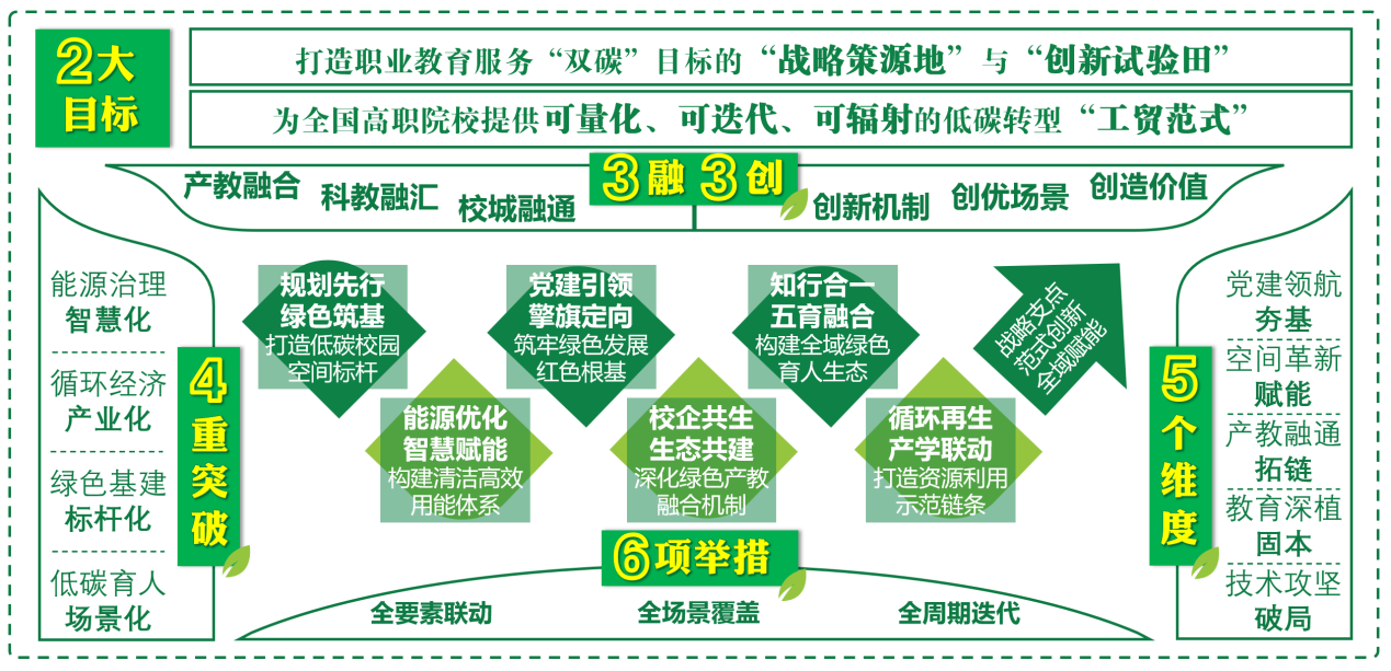 学校紧扣国家“双碳”战略,立足职业教育类型特色,创新构建了“三融三创”绿色低碳校园新范式。该模式以“校地融合、产教融合、科教融汇”为抓手,系统推进绿色基建、智慧能源管理、绿色课程体系及产教协同平台建设,形成了“技术—管理—行为”三级节能体系与“研发—中试—应用—反馈—迭代”的成果转化闭环,在绿色育人、节能减排和区域辐射等方面取得显著成效。
